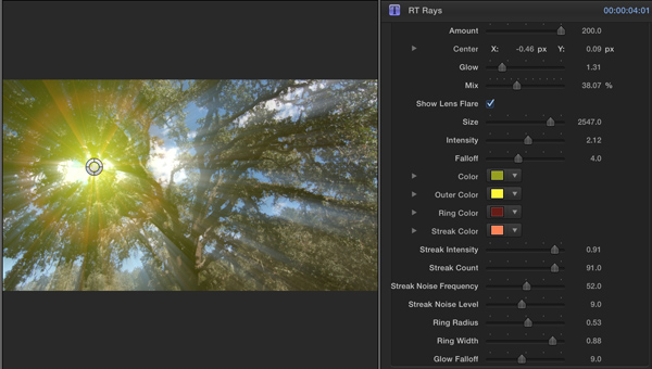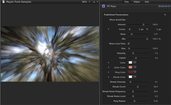 Enable Show QuickTips for some basic information on how to use the effect. RT Rays includes many parameters for adjusting the location and amount of rays. In addition, you can add a lens flare that tracks with the ray center, and includes many parameters for adjusting the intensity and colors of the flare. The default effect can be a little strong if you want realistic-looking rays.