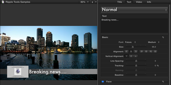 2) Adjust the Font, Size, and Color of the text. You can do all this directly in the Title Inspector. If you want an outline, glow, or drop shadow, use the Text Inspector.