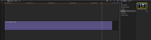 Click the Titles button on the Toolbar to open the Titles Browser. In the Custom category, locate the RT Video in Text title, then drag it or double-click it to add it to the Primary Storyline. Titles appear as purple clips in Final Cut Pro X.