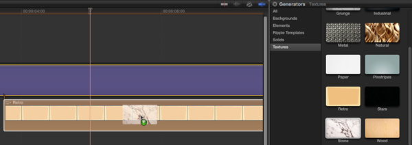 The text title also has an alpha channel in case you want to composite the video-in-text effect over a background. In the Media Browser or Effects Browser, drag the background clip below the title to create a connected clip.